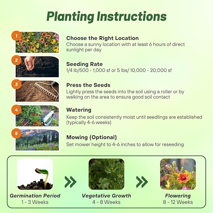 - SPRING PLANTING FOR OPTIMAL RESULTS: Plant our mountain wild flower seeds in the spring once soil temperatures reach 55°F. Keep the seeds moist through rainfall or irrigation until they germinate, promoting healthy growth and a vibrant display of wildflowers throughout the season.