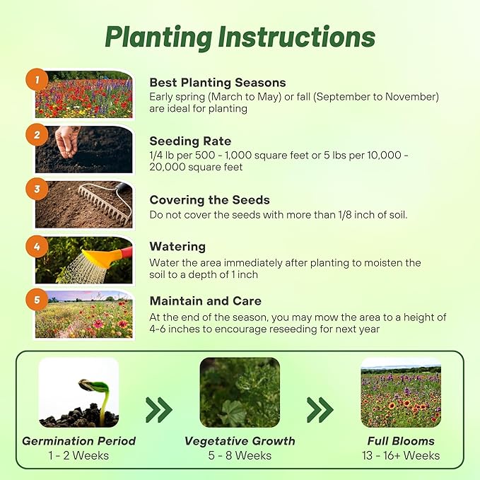 - EASY PLANTING AND COVERAGE: Our seeds can be easily broadcast or drilled into the soil at a depth of up to ¼ inch. With a sowing rate of 1/4 lb per 500-1,000 square feet, this mix provides generous coverage for various garden sizes, making it simple to create beautiful wildflower displays with seeds for planting flowers.