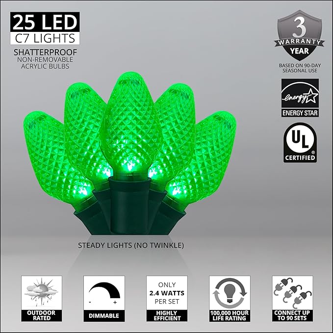 - [ 25 C7 GREEN NON-TWINKLE LED LIGHTS ] Set of 25 green C7 steady LED lights spaced 8 inches apart on green wire, 6-inch lead with fused stackable male plug, 17 feet total length. Please check bulb size before ordering (see "C7 Set Dimensions" graphic). C9 bulbs are larger than C7. Overall height of 3" vs 2.1".