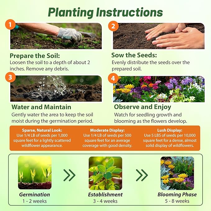 - VERSATILE COVERAGE OPTIONS: Plant a legacy with our bulk wildflower seeds, offering timeless beauty and proven resilience. With flexible seeding rates, you can customize your garden’s coverage, whether you prefer a scattered wildflower meadow or a dense, lush stand, making it ideal for any garden size or style.
