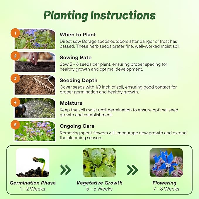 - LOW MAINTENANCE & SELF-SOWING: Borage is simple to grow and requires minimal maintenance once established. It is a self-sowing herb, meaning it will naturally reseed each year, ensuring continuous growth and beauty in your garden with little effort on your part. Perfect for gardeners seeking lasting results.