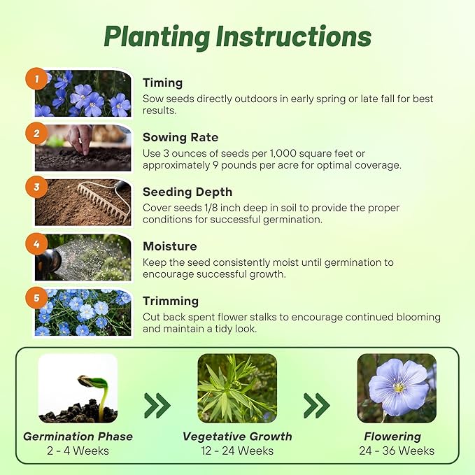- EASY TO PLANT & FAST TO GROW: Direct sow our flax wildflower seeds outdoors in early spring when temperatures reach 65 - 70°F. Lightly rake soil over seeds and keep moist until germination in 20 - 30 days. Space plants 12 - 18 inches apart for healthy growth, with sowing rates of 4 ounces per 1,000 sq. ft. or 9 - 17 pounds per acre, depending on variety and coverage needs.