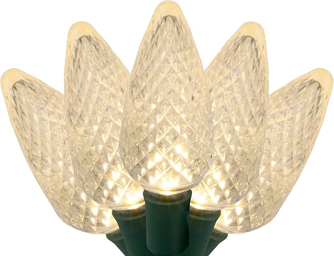 - [ 25 C9 WARM WHITE NON-TWINKLE LED LIGHTS ] Set of 25 warm white C9 steady LED lights spaced 8 inches apart on green wire, 6-inch lead with fused stackable male plug, 17 feet total length. Please check bulb size before ordering (see "C9 Set Dimensions" graphic). C9 bulbs are larger than C7. Overall height of 3" vs 2.1".