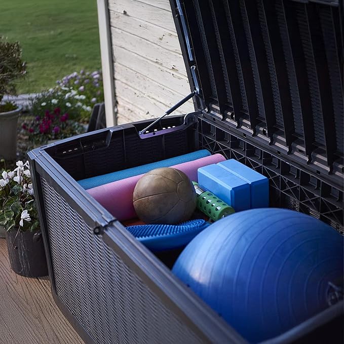 - DURABLE KETER DECK BOX: This deck storage box is constructed from durable, weather-resistant resin and has an appealing rattan- or wicker-looking texture. It is available in brown or gray. The polypropylene construction prevents rusting, peeling, and denting