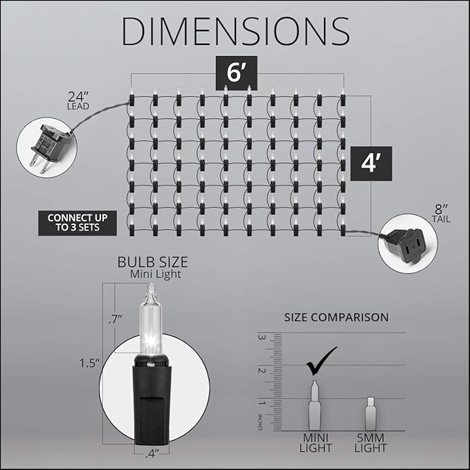 - [ MULTICOLOR NON-TWINKLE INCANDESCENT NET LIGHTS ] Set of 150 multi color steady incandescent mini lights on green wire. 24-inch lead with fused stackable male plug and 8-inch tail with female plug for easy end to end connections. Net measures 4’ x 6’ fully stretched.