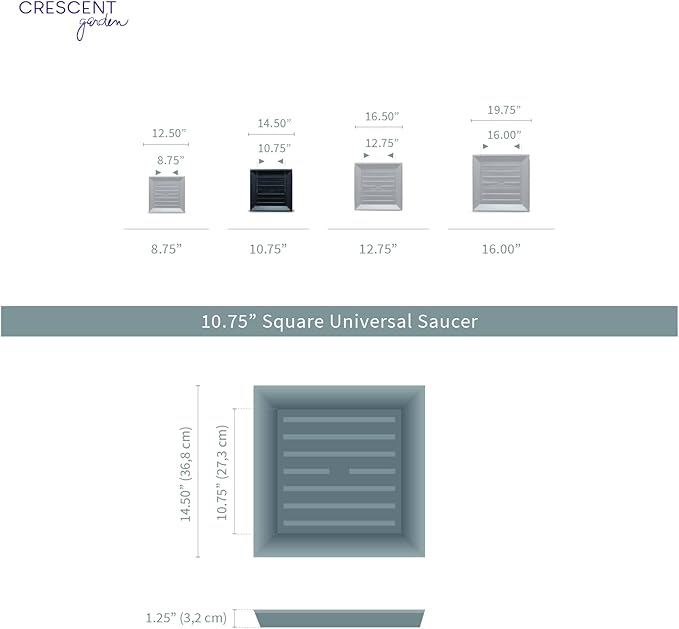 - UNIVERSAL: This shallow basin plate will add beauty and protection to a variety of planter styles. This size is ideal for planters with base size: 10.75” x 10.75”