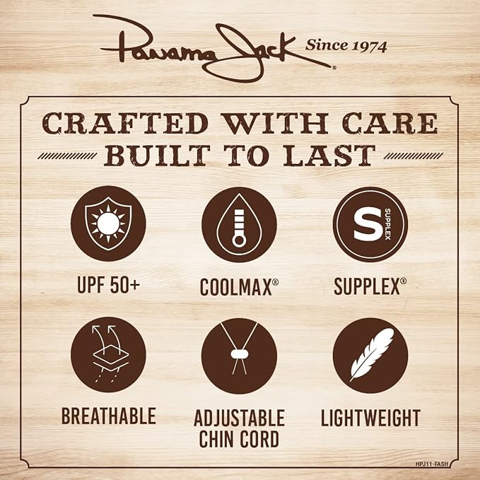 - Crafted out of polyester mesh and nylon materials, this Panama Jack Seven Seas safari sunhat for men & women is designed with a crush-able/pack-able mesh crown, chin cord with adjustable toggle, inner sweatband, and a lightweight (floppy) 3" big brim with ultimate UPF (SPF) 50+ UVA/UVB sun protection. (Open mesh crown portion not UPF rated)