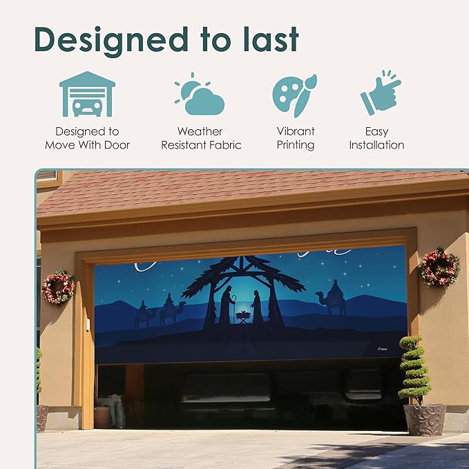 - Honor the Sacred Spirit of Christmas: Bring the true meaning of the season to your home with our 7' x 16' Peaceful O Holy Night Nativity Garage Door Banner. Featuring a serene nativity scene beneath a glowing starry sky, this banner creates a heartfelt tribute to the birth of Christ, transforming your home into a beacon of faith and peace.