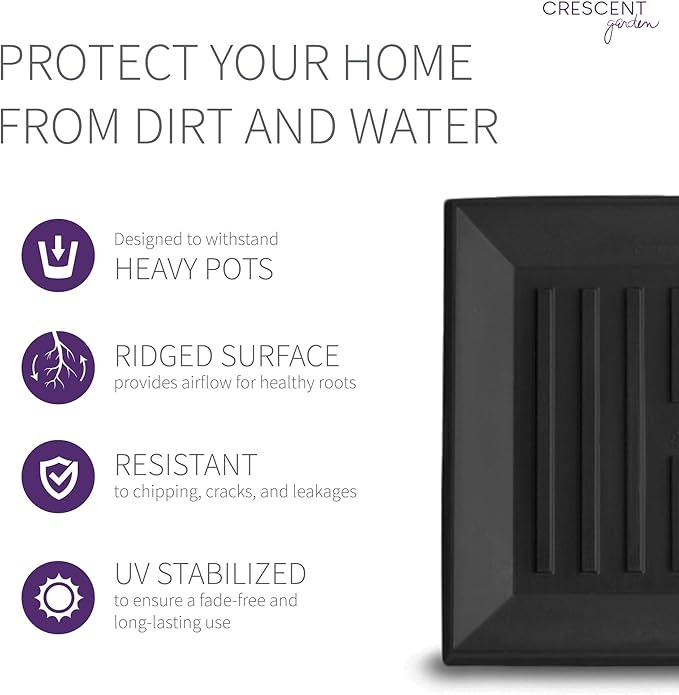 Crescent Garden Universal Square Plant Saucer, Modern UV Safe Durable Drip Tray for Square Planter, Heavy-Duty Plastic Drainage Dish, Indoor/Outdoor Flowerpot Saucer- 13'' inner x 16.75" outer (Black)