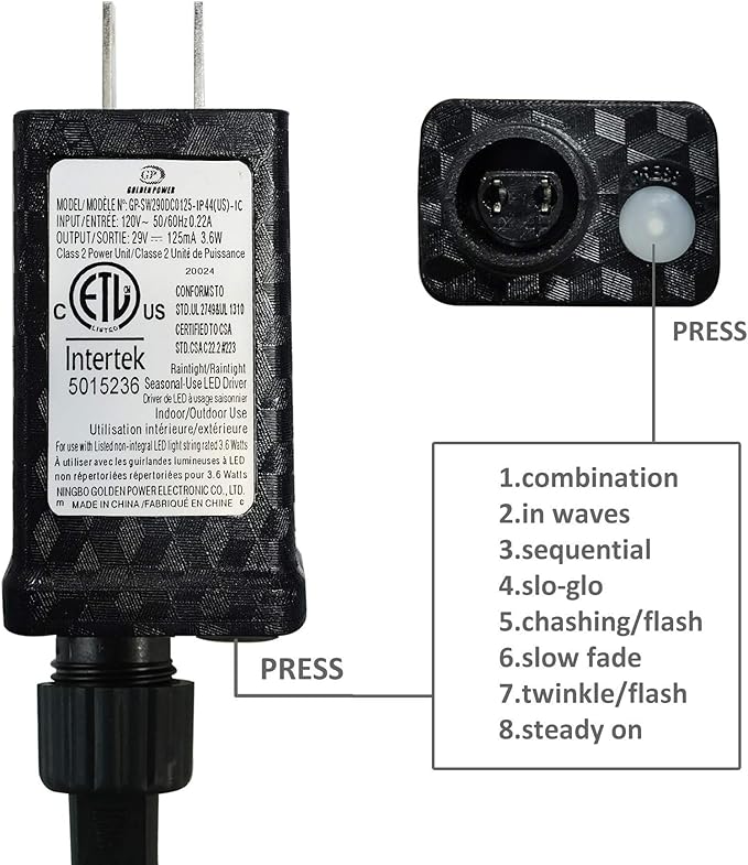 - Special Feature : 8 Lighting Effect, Low Voltage Output, Memory Function