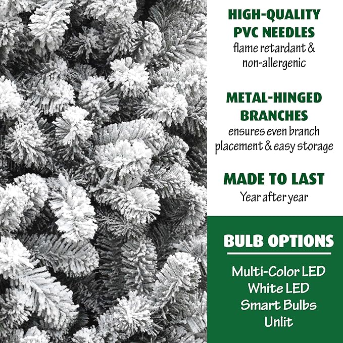 - Lightly Flocked Christmas Tree: Our premium, fade-resistant flocking material gives the appearance of freshly fallen snow and the full and dense lifelike tips create the appearance of a traditional cut tree