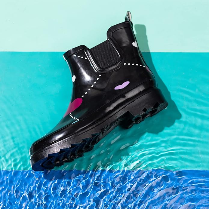 - NATURAL RUBBER CONSTRUCTION: When the wetness tries to sneak in, our cute rain shoes shut it out with a highly water-resistant, built-to-last design. They also have a rugged, chunky, and deep tread to keep you steady in slippery conditions.