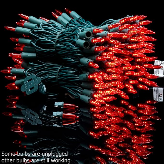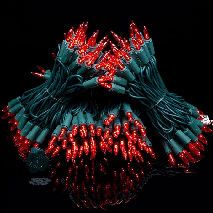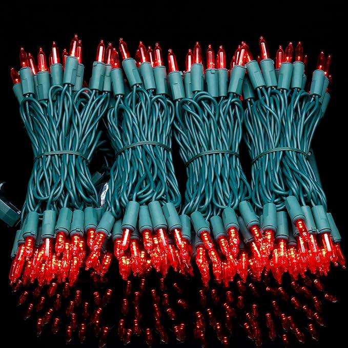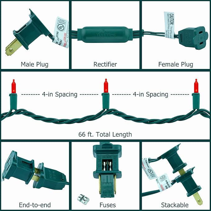 - Extra Long More Lights. 200 red LED bulbs on green wire, 1 strand total length 66 feet. 4-inch spacing, 4-inch lead, 4-inch tail. With a tangle-free design and robust commercial grade 22 AWG wire with a pure copper core, installation is swift and professional. Waterproof design allows it to be used indoors and outdoors. The versatility of our malleable string lights is limitless: adorn Christmas trees, railings, stairs, fences, bushes, or shape them creatively to match your décor.