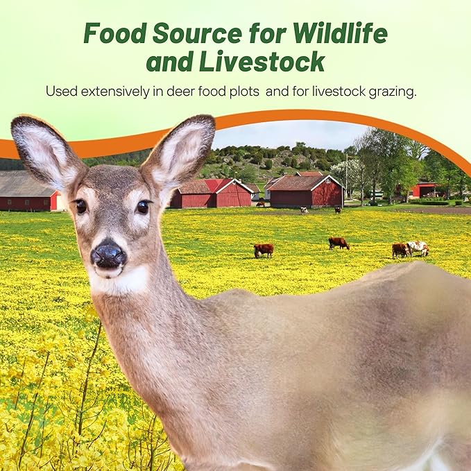 - ADAPTABILITY TO VARIOUS CLIMATES & CONDITIONS: This brassica rapeseed is heat, cold, and drought-tolerant, making it suitable for USDA Zones 5-9. It retains leaf and stem quality in frost and cold conditions, providing reliable forage during autumn and winter. Its adaptability makes it perfect for creating durable outdoor food plot and pastures that can withstand harsh weather.