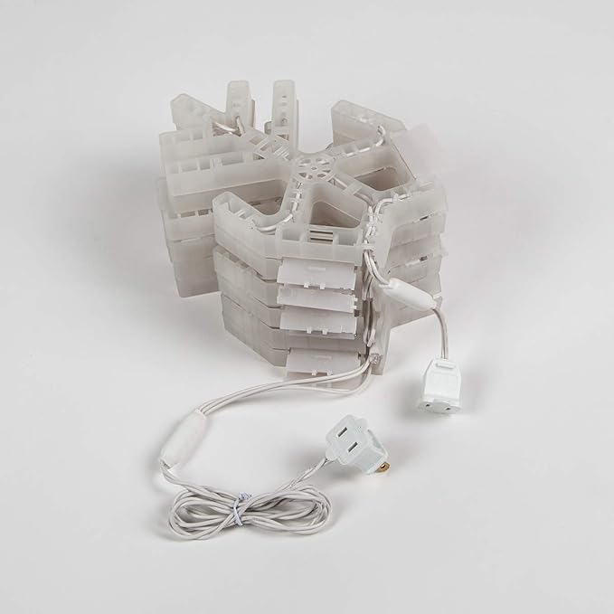 - [ TWINKLE LIGHTS! 20” SNOWFLAKE DECORATION with COOL WHITE LED TWINKLE LIGHTS ] 20-inch folding snowflake decoration lit with 70 cool white twinkle LED lights. 42-inch power cord with fused stackable male plug and 5-inch tail with female plug for end to end connections.