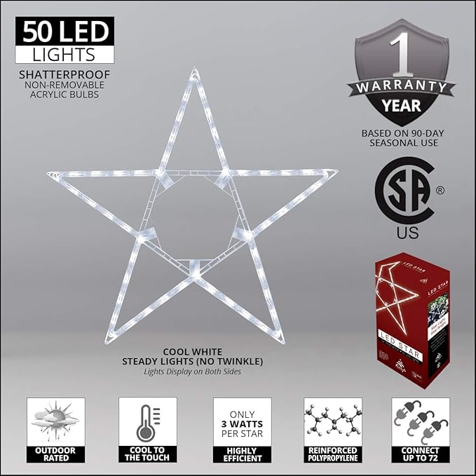 - [ CSA US CERTIFIED, SAFE, DEPENDABLE ] Approved for indoor/outdoor use. If one light goes out the rest stay lit. Ideal for Christmas star lights, lighted outdoor Christmas decorations, wedding stars, anniversary stars, party lights and more.
