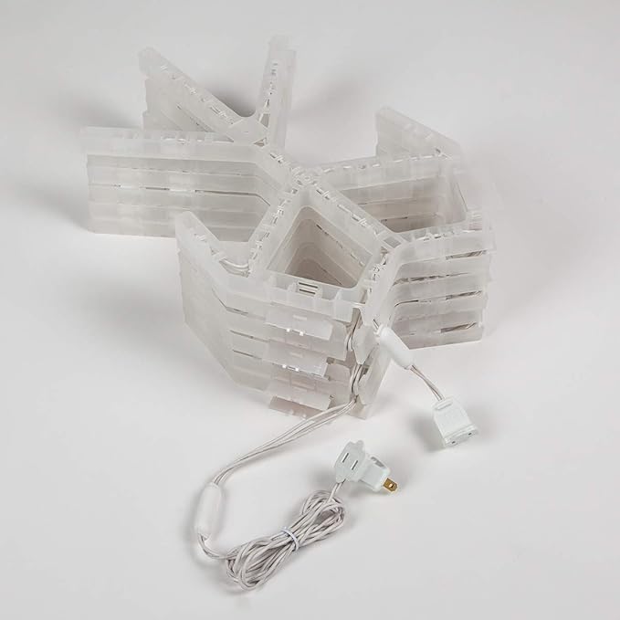 - [ 36” SNOWFLAKE DECORATION with COOL WHITE NON-TWINKLE LED LIGHTS ] 36-inch folding snowflake decoration lit with 105 cool white steady LED lights. 42-inch power cord with fused stackable male plug and 5-inch tail with female plug for end to end connections.