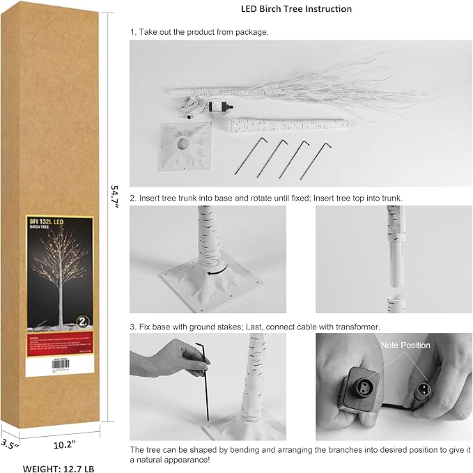 - Durable Material: Natural birch hand-paint finish covered over whole tree including branches, is more costly than only plastic tape wrapped birch trees. 8FT 132L LED birch tree, warm light, 16FT extension cord.