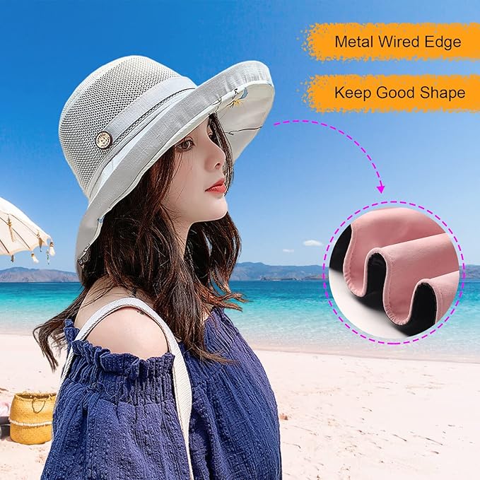 Women Wide Brim Sun Hats Metal Wired Edge Summer UV Protection Beach Fishing Hat for Hiking Garden Travel Chin Strap