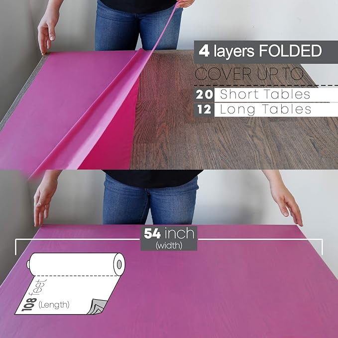 - ✔️PREMIUM QUALITY & 100% SATISFACTION GUARANTEE: Our party essential roll is smell-free made of thick plastic which weighs 110g per 54" x 108" sheet (20g more than others). It can cover up to 12 big 8-inch long tables. Our high-quality plastic cover is wrinkle-resistant, providing superior protection to your table against stains, spills, and scratches at outdoor or indoor events.