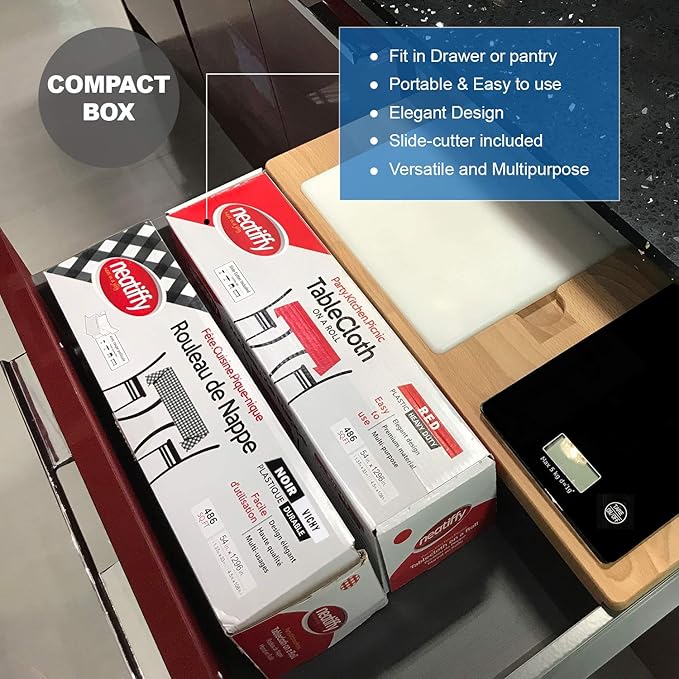 - ✔️SLIDE-CUTTER FOR CUSTOM LENGTH: Cut to suit your preference and party needs! Each roll of tablecloth is equipped with a slide cutter, allowing you to create a perfectly sized plastic cover for Rectangle, Square, Round or Oval tables. Our covers are neatly rolled in a box, so you can cut as much as you need while keeping the rest for later.