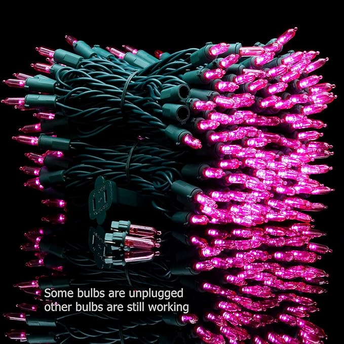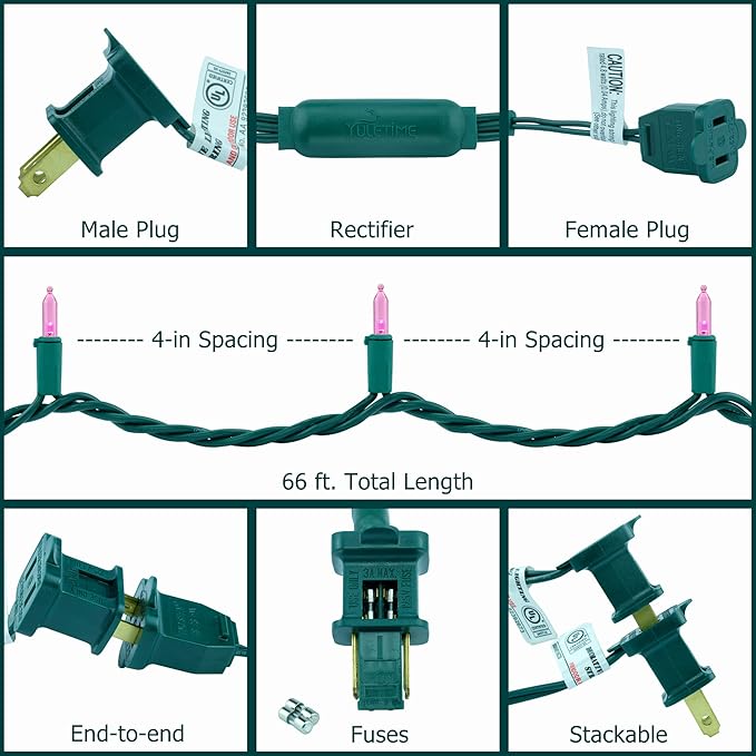 - Extra Long More Lights: 200 pink LED bulbs on green wire, 1 strand total length 66 feet. 4-inch spacing, 4-inch lead, 4-inch tail. Commercial grade 22 AWG wire with pure copper core, tough and heavy duty. Waterproof design allows it to be used indoors and outdoors. Strings can provide extended use of end-to-end connections. The entire string lights power is 7 watts and the rated maximum connection power is 216 watts with up to 30 strands running simultaneously.