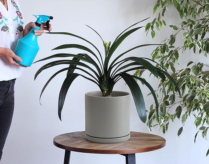 D'vine Dev 10 Inch Ceramic Planter Pot with Drainage Hole and Saucer, Indoor Cylinder Round Planter Pot, Grey, 94-O-E-3