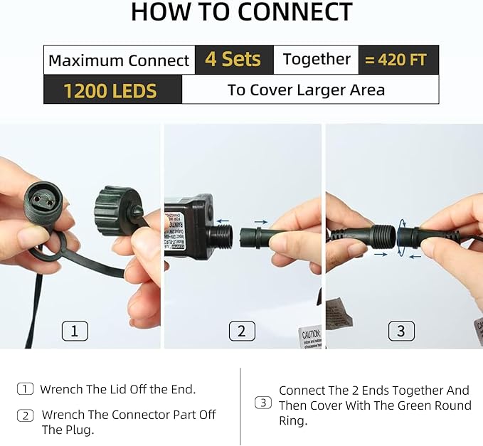 - 300 LEDs 105ft, Support 4 Sets End To End Connectable: Each Set Comes with 300 Beautiful MULTI-COLOR Glow Leds On The 99ft Light Strand, You Can Buy 4 Sets To Connect Together, Total 396 Ft, 1200led Enough To Cover Larger Area.