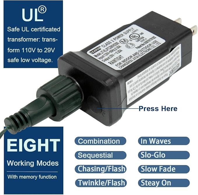 - 【Intelligent 8 Lighting Modes Twinkle Lights】: 8 Functions modes to fit different occasions, moods, feelings, holidays, festivals, anniversaries, etc. (Combination, In waves, Sequential, Slow Glow, Chasing/Flash, Slow fade, Twinkle/Flash, Steady on). Adjust the lighting modes by pressing the round button on the adapter. And it will intelligent remember your last choice, no need to reset every time.