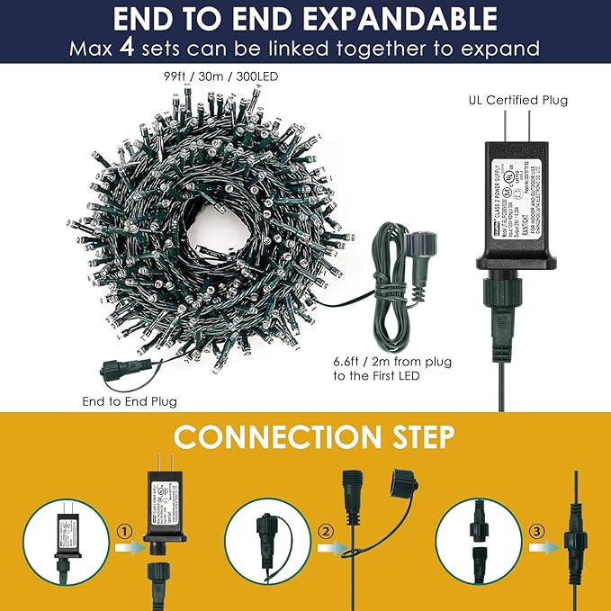 Decute 300LED Christmas String Lights Outdoor Waterproof 105FT UL Certified with End-to-End Plug 8 Modes, Cool White Indoor Starry Fairy Lights for Christmas Tree Patio Garden Wedding Party Decor