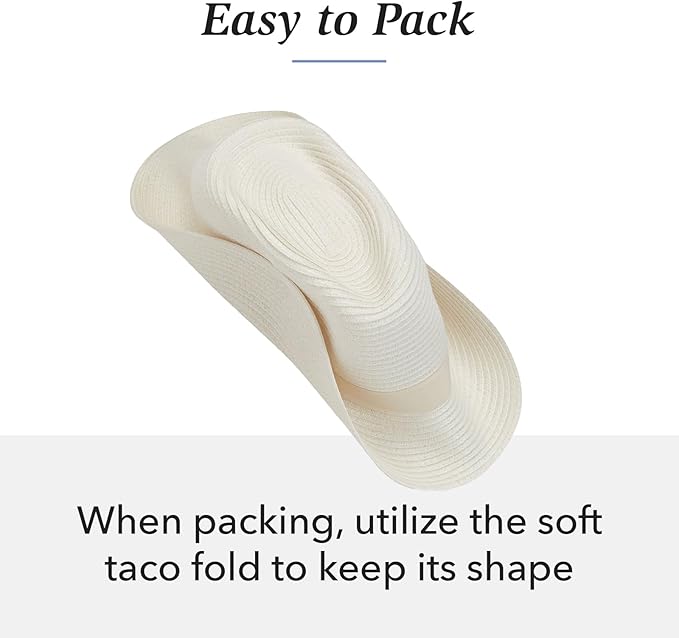 - A TRAVEL ESSENTIAL: This lightweight, packable sun hat is perfect for your adventures. Use the Soft Taco Fold to pack it easily in your luggage: gently fold the sides together, surround with clothing for brim support, and place small items like socks in the crown to maintain its shape. Ideal for beach days, park outings, garden parties, and church events.