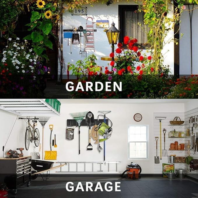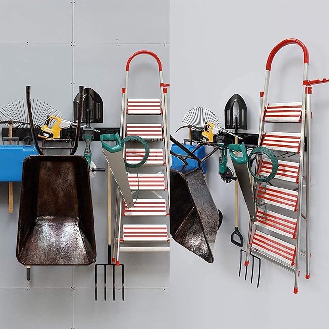 - Perfect wall mount garage tool organizer storage system. Ski snowboard storage rack, garage bike rack, cleaning supplies organizer, garden tool organization such as ladders, lawn trimmers, strollers, folding chairs, shovels, rakes, power tools, etc