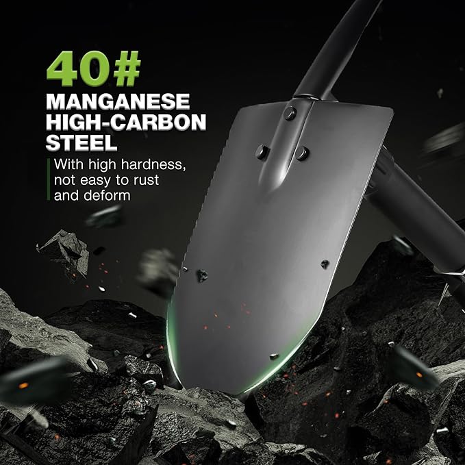 - High Quality Material: This heat-treated mini folding camping shovel is crafted from high quality manganese steel with a long service life, rust resistance and deformation resistance.