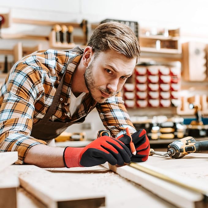 - GARDEN GLOVES FOR MEN - Breathable and comfortable polyester base in red and black to keep your hands cool and dry. No sweaty hands in Spring and Summer. Stretchy seamless knitted work gloves deliver flexibility and dexterity. Long cuff to keep unwanted dirt & debris out. Elastic wrist for easy on and off.