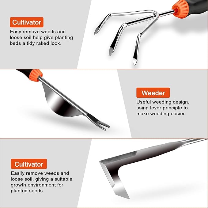 - 【Sturdy Stainless Steel】Our heavy-duty gardening kit for men is constructed of stainless steel, which inhibits rust and guarantees durability. It is lightweight, so you can use it flexibly for gardening work, and your hands are not easily fatigued.The non-slip, soft rubber grip handle makes them a pleasure to use. Additionally, gardening comfort is greatly enhanced by the ergonomic design.