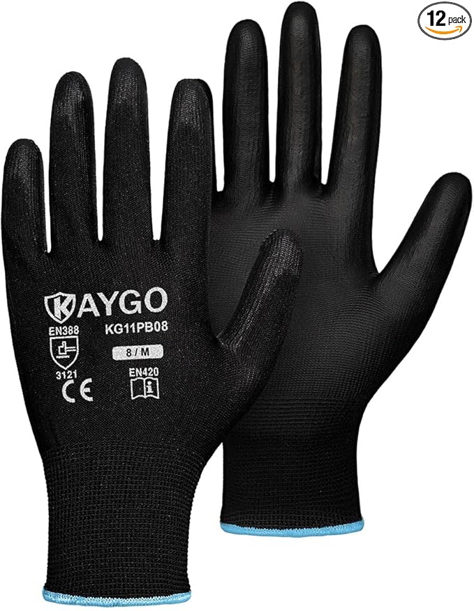 KAYGO Safety Work Gloves PU Coated,60 Pairs KG11PB Seamless Knit Glove for Men and Women, with Smooth Grip on Palm and Fingers, Ideal for General Duty Work (Medium, Black)
