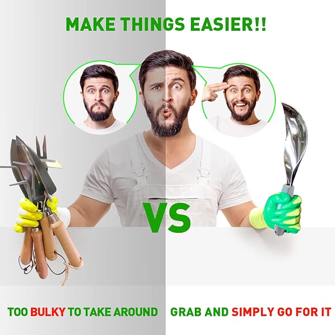- BYE BYE "Carrying Heavy Tool Set Around" - This all-in-one garden tool can perform as cultivater, soil scoop,trowel, weeder, bulb digger. Etched measurement makes proper planting depth and the sharp serrated edges easily cut through roots and vines.