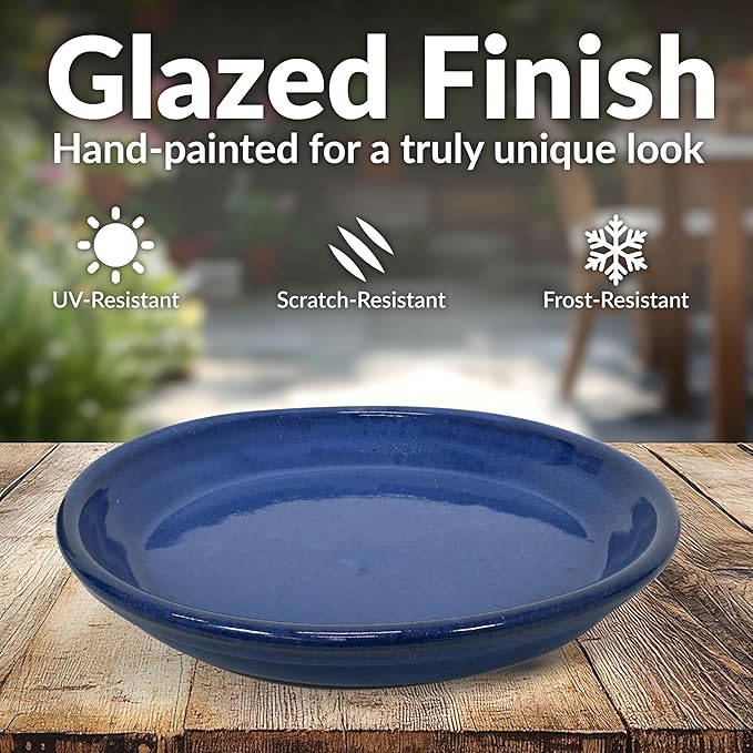 - DESIGNED FOR BEAUTY AND STRENGTH: These ceramic plant dishes are hand-painted with a rich, glazed finish and placed in a kiln for classic, shining beauty. Please note, variations in color may occur due to manual glazing and the unique kiln firing process. The glazed finish also protects the saucer in most weather conditions for lasting use.