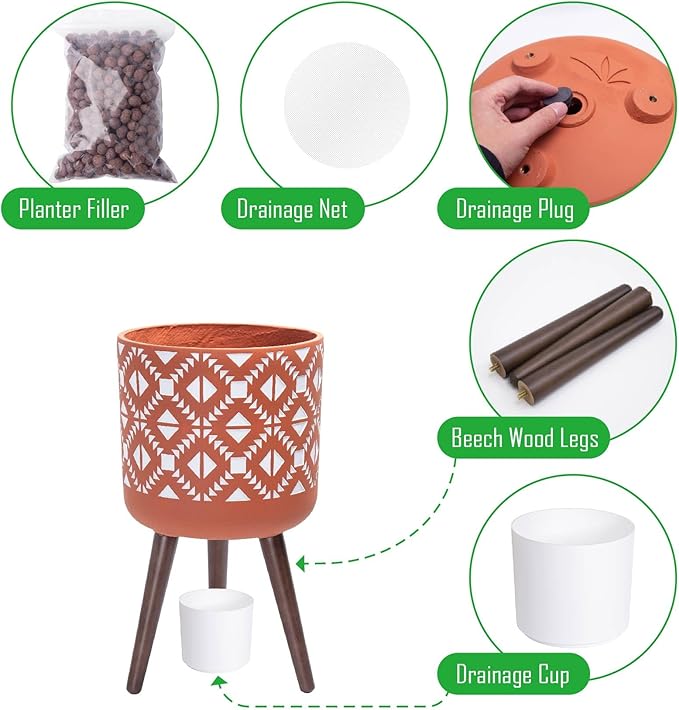 - Special Feature : Mid-Century Modern Design, Geometric Fiberclay Pot, Solid Wooden Legs, Enhanced Drainage and Care Accessories Mid-Century Modern Design, Geometric Fiberclay Pot, Solid Wooden Legs, Enhanced Drainage and Care Accessories