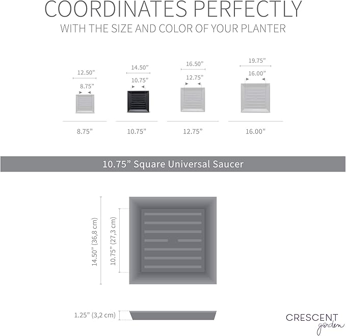- UNIVERSAL: This shallow basin plate will add beauty and protection to a variety of planter styles. This size is ideal for planters with base size: 10.75” x 10.75” inside diameter.