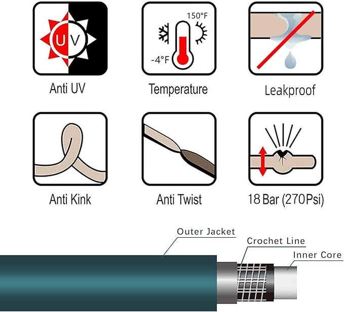 - Anti-Kink Engineering: Engineered to maintain 98% water flow efficiency during prolonged use, our 5-layer construction PVC matrix with helical reinforcement eliminates hose deformation; This kink-resistant solution reduces watering interruptions by 70% compared to standard garden hoses, translating to 15% faster task completion for garden irrigation and vehicle washing applications