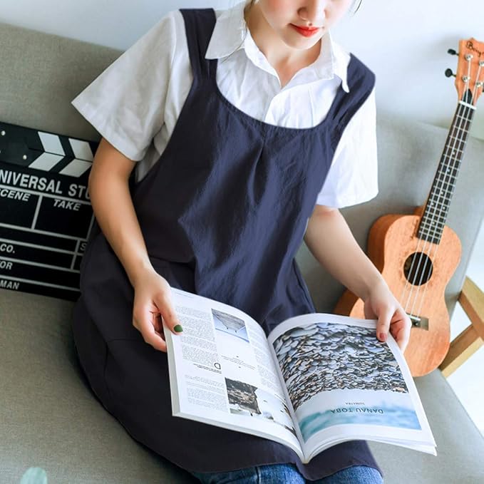 NEWGEM Japanese Linen Cross Back Cooking Aprons for Women Men with Pockets Cute for Baking Kitchen