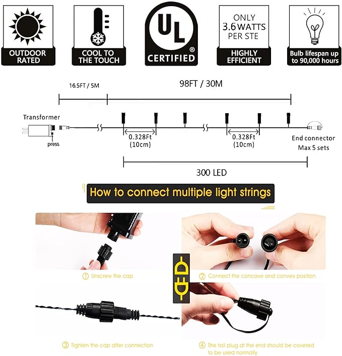 - 8 Modes And Memory Function: Our string lights have 8 lighting modes: combination, in waves, sequential, slogs, chasing/flash, slow fade, twinkle/flash, and steady on. Fit different occasions, moods, feelings, holidays, festivals, anniversaries, etc. Pressing the round button on the transformer to change the lighting modes. And it remember the last set after cutting off the power , no need to reset the mode