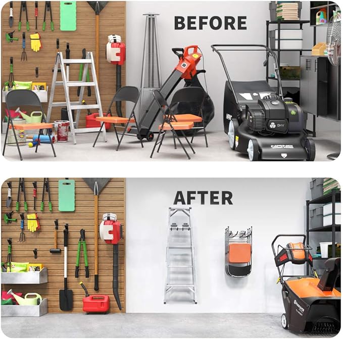 - WALL MOUNT GARAGE ORGANIZER STORAGE SYSTEM- Ski snowboard storage rack, garage tool rack, cleaning supplies organizer, garden tool organization such as car tires, ladders, lawn trimmers, strollers, folding chairs, shovels, rakes, power tools, etc