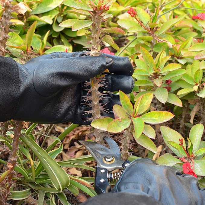 - THICK GARDENING GLOVES THORN PROOF: This heavy duty genuine leather gardening gloves is thorn resistant that will protect your hands safe from rose thorns, thistles, brier plants and so on. Professional thorn proof gardening gloves for women and men to prune rose and trime cactus
