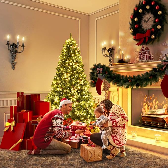 GOFLAME 7ft Artificial Pre-lit Christmas Tree with Warm White LED Lights and Pine Cones, Home Holiday Décor, Hinged, 925 Branches for Indoor Decoration Easy Setup