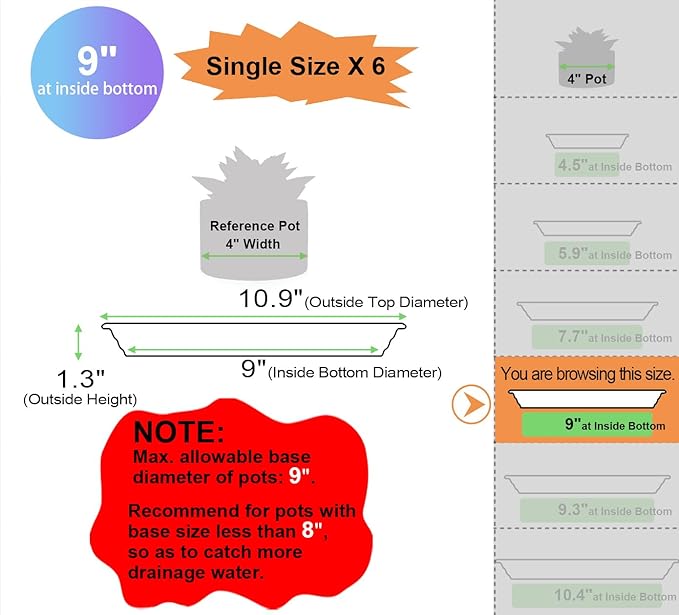 - Single Size Package: Each plant saucer is 1.09 in(D) x 1.3 in(H) at outside, 9 in at inside bottom; To ensure the plant trays fit your pots, please carefully read the information on the 2nd picture