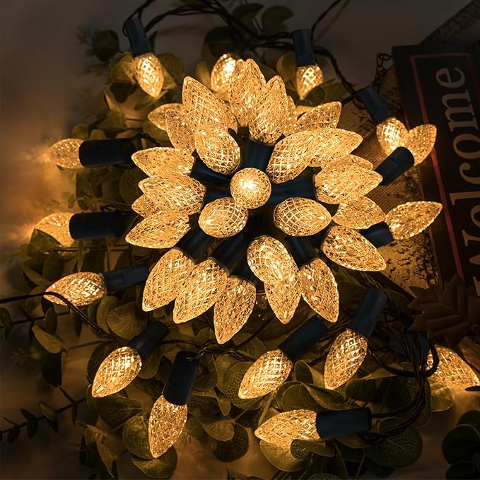 - High Quality: 100 LED 33 FT pine cones shaped string lights with solid construction plastic material, adapter powered. 30V low voltage string lights with UL 588 certified for safety use. Length between lights :4Inches, power line: 9.8ft. light string: 32.8ft, length totally: 42.6ft approx. The controller has memory function, which could recover from the previous setting mode when you restart.