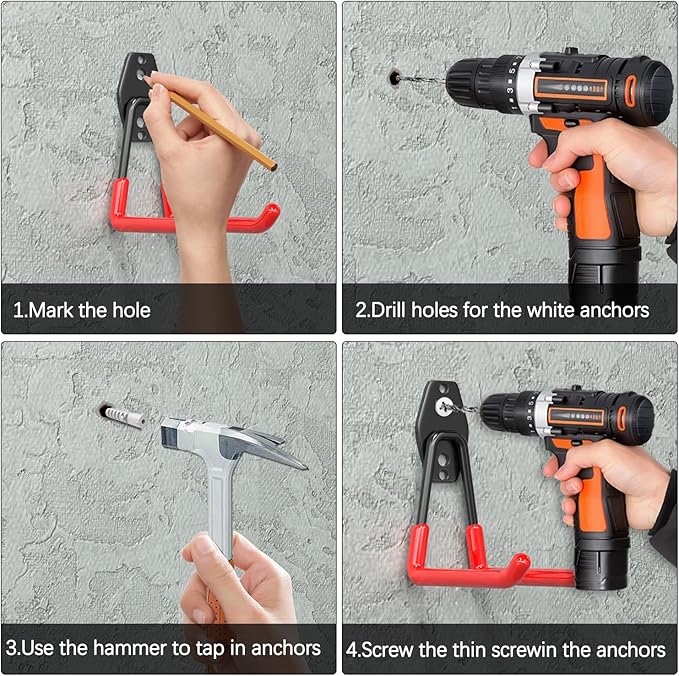 - Easy To Install: These heavy duty garage hooks are suitable for various walls. You can install them effortlessly. For plaster walls: (1) Insert black expansion screws into the two large holes of the ladder hanger; (2) Low speed drilling or manual tightening of steel screws. For wooden/brick/concrete walls: (1) Mark the two small holes for the garage tool hanger on the wall; (2) Drill holes and insert white expansion pipes; (3) Drill in steel screws
