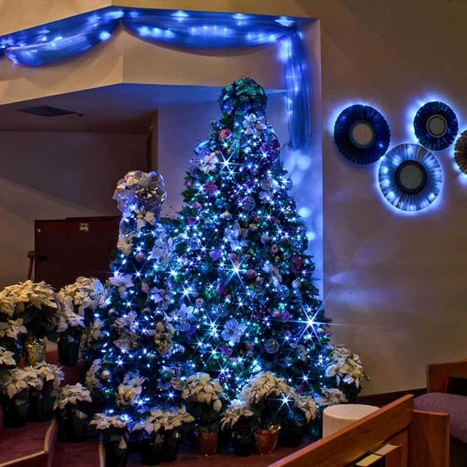 - Extra-Long Blue Christmas Lights 82FT 200 LED Plug in String Lights: Super bright with new upgraded LED bulbs. This Extendable 200 LED green wire plug in string lights have 8 lighting modes to satisfy your diverse decorative effect. Total length is 75.8ft, of which 66ft with lights.